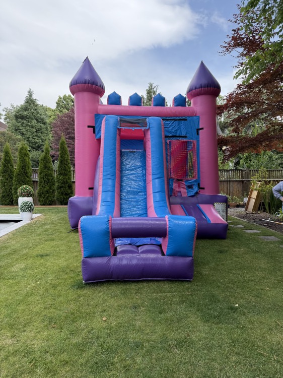 A castle‑themed pink-and‑purple combo built for dry play—no water needed. It pairs a roomy bounce area with a climb-and-slide, surrounded by safety mesh for airflow and easy supervision. Royal vibes, secure entry, and soft landings make it a photo-ready centerpiece for backyards, gyms, and school events.